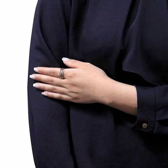 ホワイトゴールドの穏やかな輝きと、緻密に配置されたダイヤが手元にモードな気品を添えます。