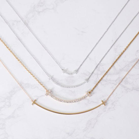 Tスマイルネックレスは、肌に溶け込むようなミニやスモールをはじめ、一目で印象に残るサイズ感のものまで、幅広いバリエーションで展開されています。